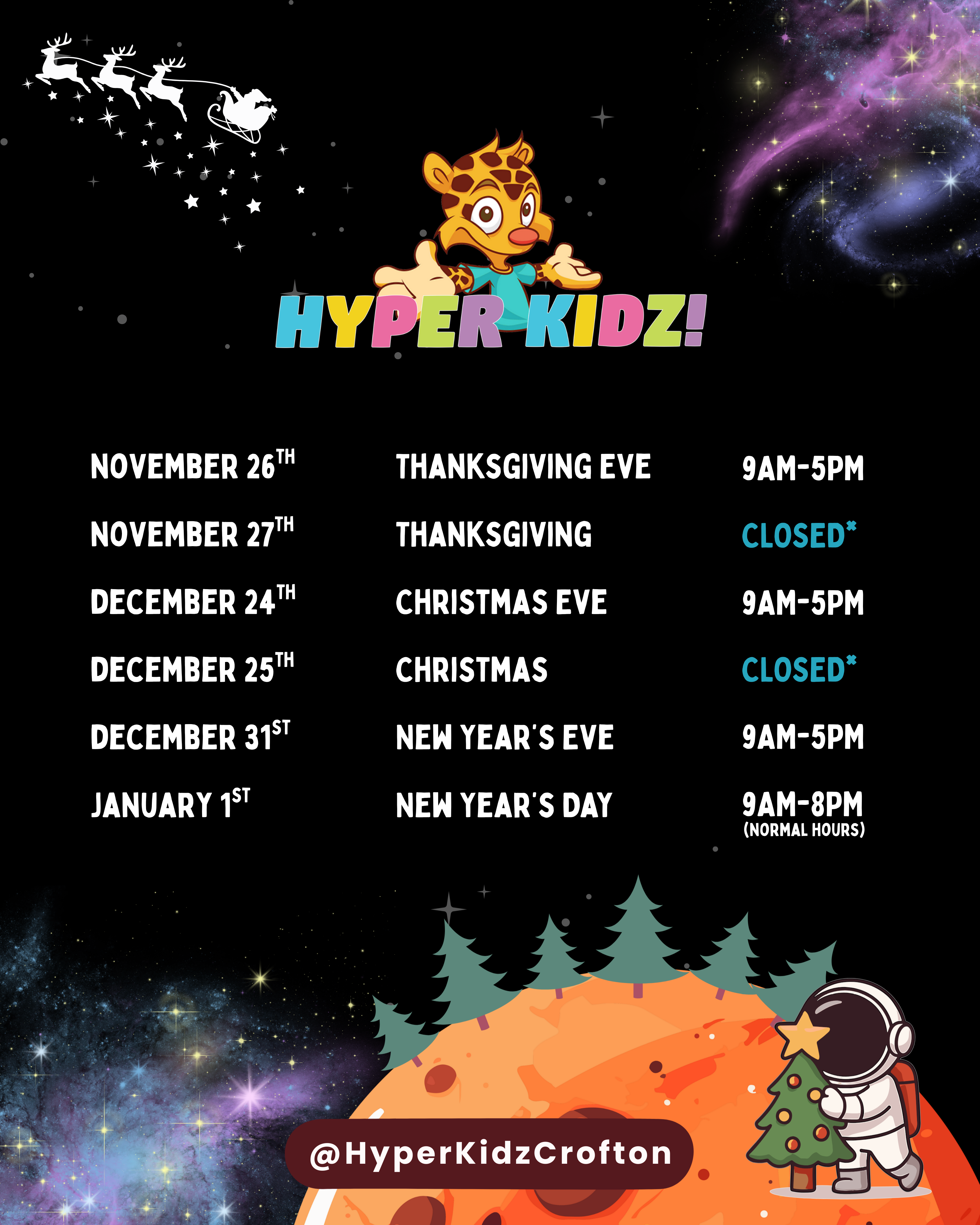 Play is the work of the child and is beneficial to their mind and body. Hyper Kidz offers a unique indoor playground for children to explore with a fun theme, plenty of fun attractions, and play zones that are safe and designed for different developmental age groups. Our 16,000 sq ft indoor playground is the perfect place to bring your child for open play or to host their next birthday party! We offer unlimited play 7 days a week for children ages 0-13. Come play with us!
