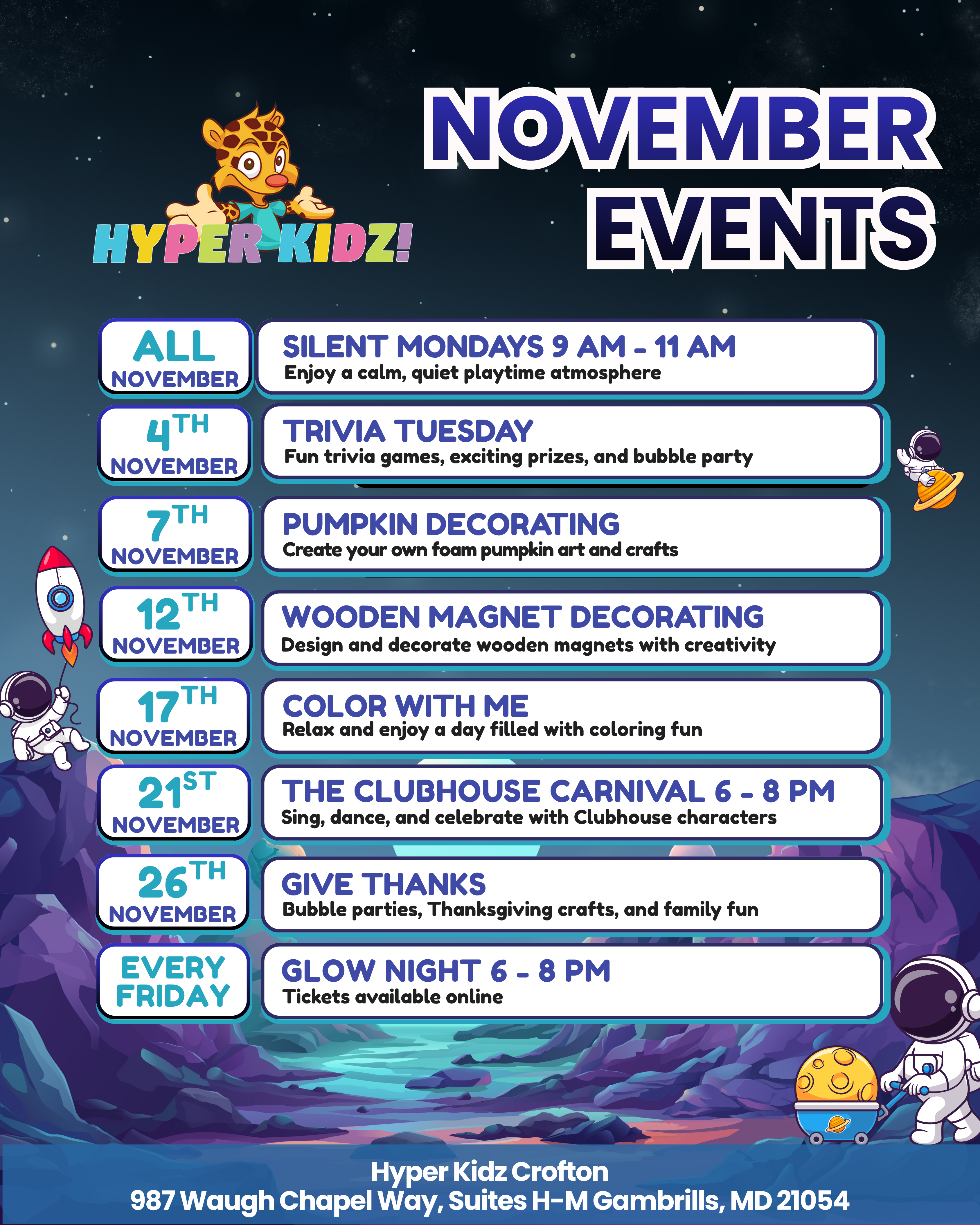 Attractions include an interactive LED dance floor, giant pin screens, and multi-level play structures. Hyper Kidz encourages healthy and active social play. Therefore, we do not offer video games, coin-operated games, or arcade games.